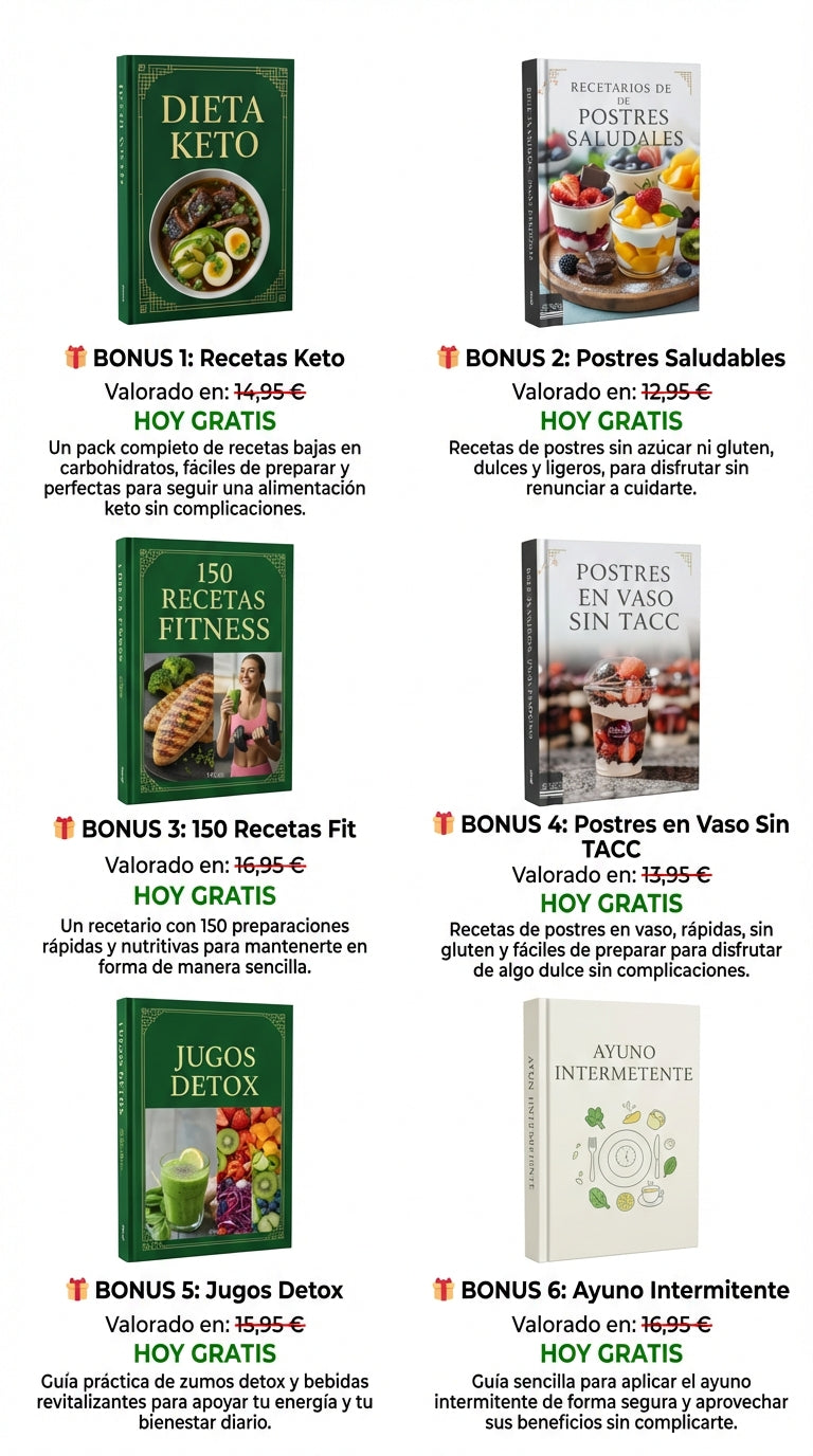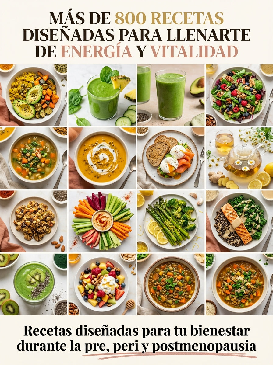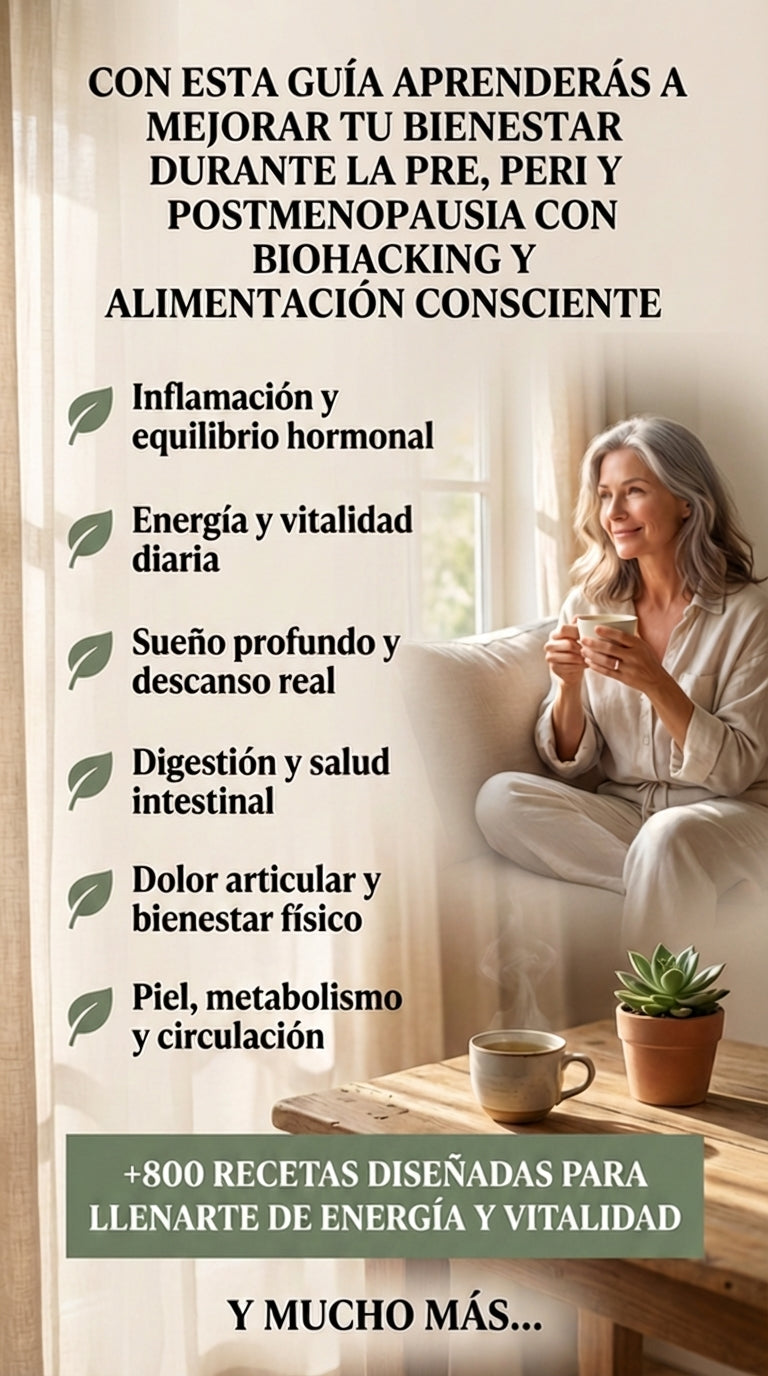 No. Aunque incluye más de 800 recetas diseñadas para llenarte de energía y vitalidad, la guía también incorpora principios de biohacking y alimentación consciente pensados para ayudar a regular el sueño, mejorar el estado de ánimo y favorecer el equilibrio hormonal durante la pre y postmenopausia.